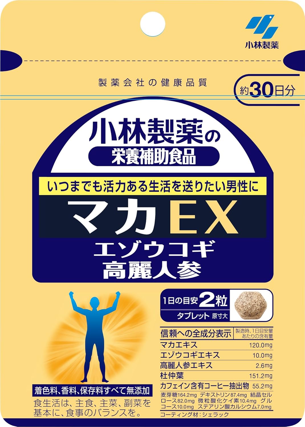 原産国 : 日本 原材料 : 麦芽糖、杜仲茶、マカエキス、デキストリン、エゾウコギエキス、グルコース、高麗人参エキス、結晶セルロース、カフェイン(抽出物)、微粒酸化ケイ素、シェラック、ステアリン酸カルシウム 内容量 : 60粒 商品サイズ (幅X奥行X高さ) : 100mmx10mmx140mm 質量 : 25