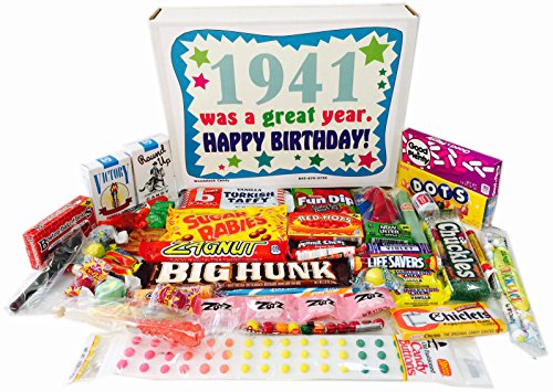 -. Binding : Misc. -. Brand : Woodstock Candy -. Feature : SurP.R.Ise a 76 year old with candy from their past / Makes a great gift for someone who has everything / Everyone loves candy! / Comes shrink wrapped in a box that measures 11.75" x 9" x 2" / Box reads "1941 was a great year. Happy Birthday!" -. IsAdultProduct : 0 -. Label : Woodstock Candy -. Manufacturer : Woodstock Candy -. PackageQuantity : 1 -. ProductGroup : Grocery -. ProductTypeName : GROCERY -. Publisher : Woodstock Candy -. Studio : Woodstock Candy -. Title : 1941 76th Birthday Gift Box of Nostalgic Retro Candy from Childhood for a 76 Year Old Man or Woman Born in 1941