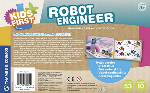 -. Binding : Toy -. Brand : Kids First -. EAN : 0071986880191 -. Feature : Read the funny story of two inquisitive kids in this read-along and build-along adventure / Build simple, non-motorized models of the robots they construct and fix during their adventure to an automated candy factory / The robots have moving parts, wheels, and gears / Kids can learn firsthand about simple machines and gear trains / Large, colorful plastic building pieces make it easy for small hands to put the models together -. IsAdultProduct : 0 -. Label : Thames & Kosmos -. Manufacturer : Thames & Kosmos -. Model : 567009 -. MPN : 567009 -. NumberOfItems : 1 -. PackageQuantity : 1 -. PartNumber : 567009 -. ProductGroup : Toy -. ProductTypeName : TOYS_AND_GAMES -. Publisher : Thames & Kosmos -. Studio : Thames & Kosmos -. Title : Kids First Robot Engineer Kit and Storybook -. UPC : 814743012042 -. Warranty : 30 day warranty against manufacturer defects