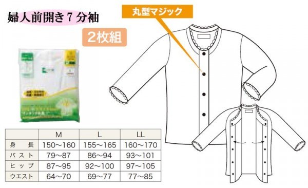 脱いだり着たり、毎日の動作が簡単にできるよう、ボタンやデザインにしっかり工夫を凝らしています。 製造国:中国 素材・材質:綿100% 仕様:40単糸フライス編み衿・袖口ピコレース付洗濯機OK乾燥機不可 ※サプライヤー直送品  ご注文後2~3営業日後の出荷となります【商品名】コべス 婦人前開き7分袖(婦人用2枚組)ホワイト AB50 L