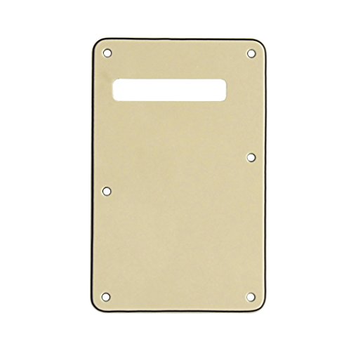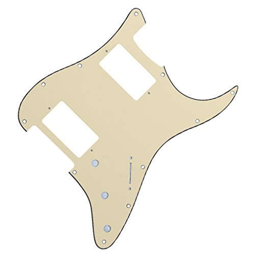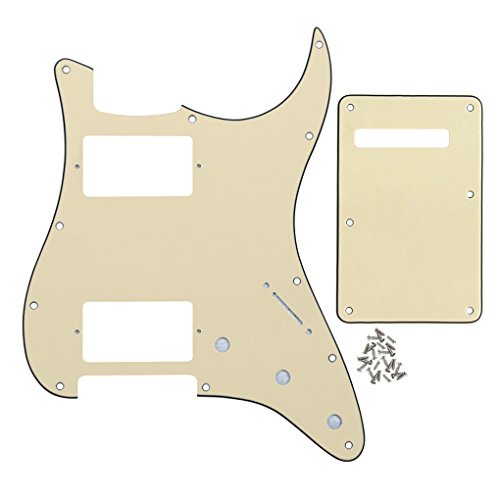 Product Description Specification:Humbucker-Humbucker pickguard, 11 hole standard mounting pattern with counter-sunk mounting screw holes.3 control pot holes pre-drilled in Standard Volume-Tone-Tone Positions (Positions 1, 2, 3).1 standard size switch cut with 2 switch mounting holes (1 each side of switch cut; not counter-sunk).Humbucker hole size: 38mm x 70mmHumbucker screws center/center: 78mmTremolo Spring Cover/Back Plate with standard 6 screw mounting hole pattern.Material: Made of 3ply PVC, with off set screw holes and beveled edge.With pure aluminum foil shielded.Color: Cream ColorWith protective film on the surface, while using please split it off.Note:Item's color might be different from the picture because of the aberration.Package Includes:1 x guitar pickguard1 x back plate25 x mounting screws 0
