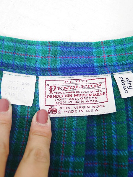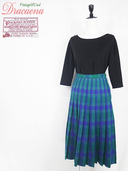Ladies ブランドPendleton ペンドルトン カラー緑・青 メール便不可 コンディション★★★ モデル- 素材ウール100% 表記サイズ8 スタッフコメント裏地なし。ウェスト下、中央にヨゴレあり。 実寸サイズ 着丈 69.5 cm ウエスト 25 インチ( 64 cm) ※ウエスト・ヒップ以外は平置き採寸