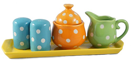 Studio : Creative Co-Op Publisher : Creative Co-Op Product Description Entertain your favorite guests with our lovely kitchenware set! Features a polka dotted kitchenware set; Sugar jar (Orange), Creamer with handle (Green), Salt pepper shakers (Blue) a tray (Yellow). Measurements include: Tray 12.5"L - Sugar 3.25"W x 4.50"H - Creamer 4.50"W x 3.50"H - Shakers 2"W x 3"H. Made of stoneware. A beautiful set to complete your colorful kitchen or give as a gift, sweetness indeed! 0