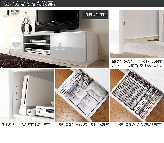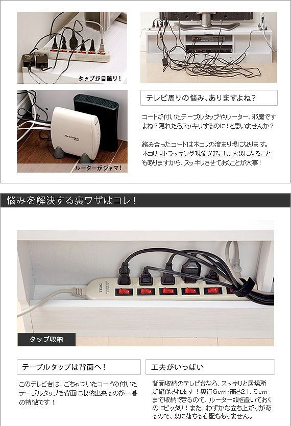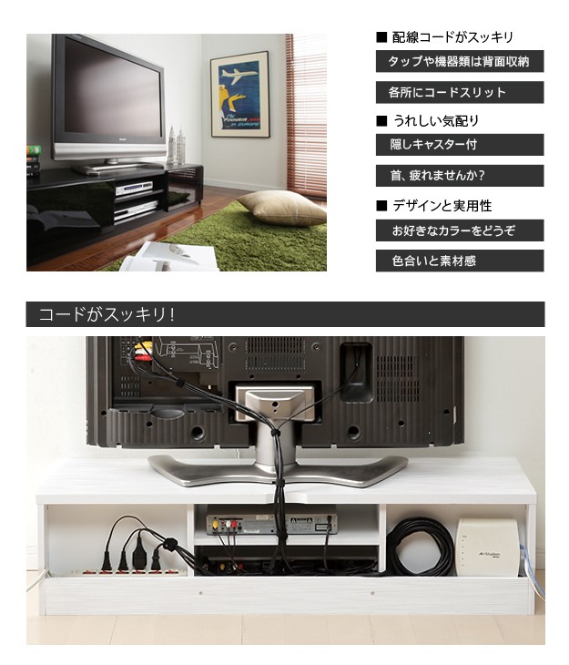 ●商品について:背面収納タイプのTVボード。背面にはコード収納スペースがあり、コンセント類や配線をすっきりとまとめられます。キャスター付きで配線作業、お掃除はラクラク。可動棚板1枚付き。天板耐荷重50kg、テレビサイズ目安27V型まで