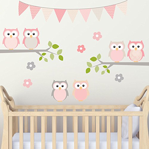 Decal the Walls Nursery Room Owls on Branch Pink and Grey 100% Woven Fabric Adhesive Back Decal