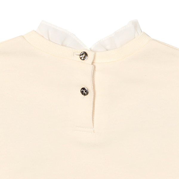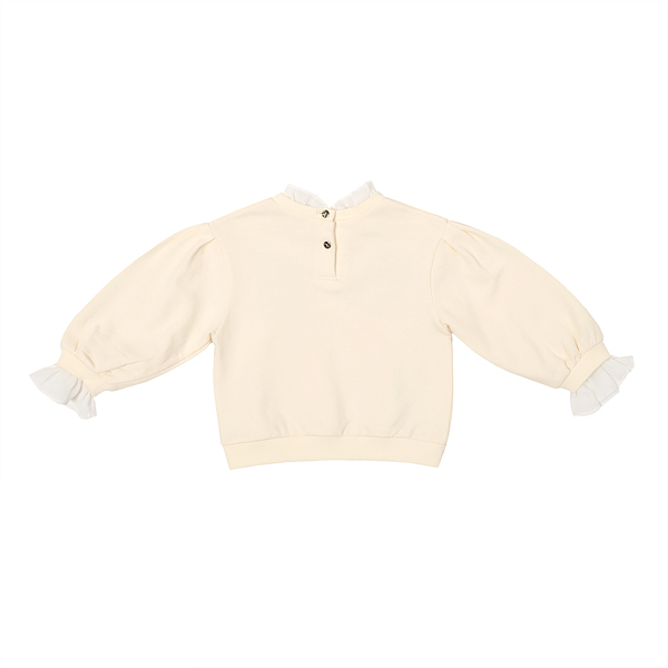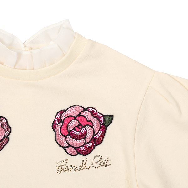 상품설명 아이보리 컬러의 편안한 기모 면 소재로 되어 있어 간절기에 코디하기 좋은 맨투맨입니다. 목프릴과 손몰 프릴이 있어서 사랑스러운 느낌을 주고 앞판에 트렌디하게 장미 자수를 양쪽으로 주어 귀여운 제품입니다.
