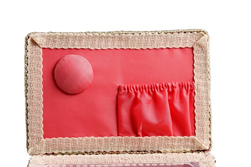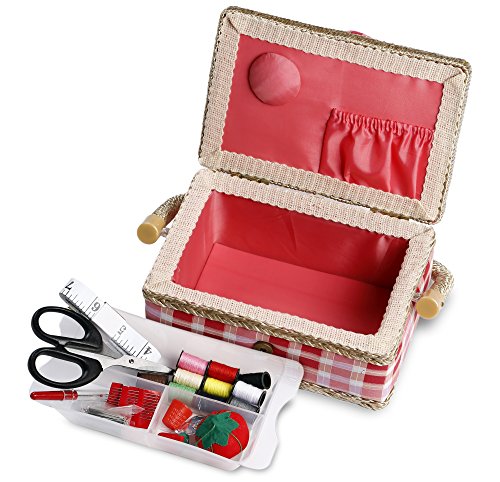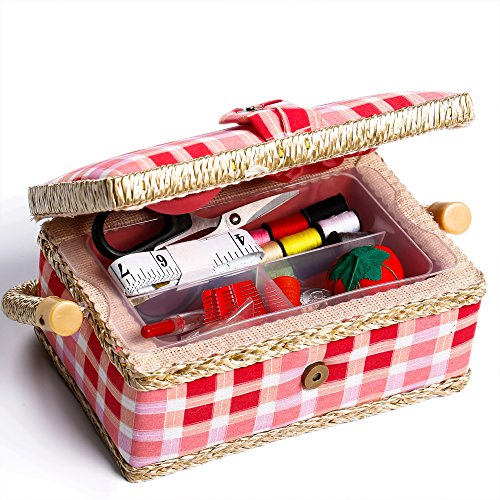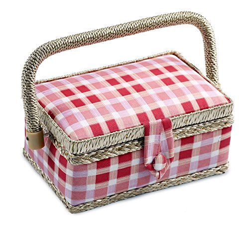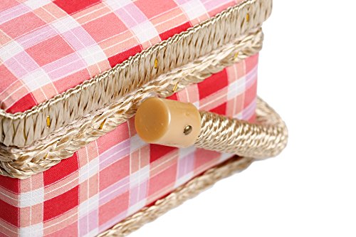Quality Craftsmanship - Sewing Basket is crafted from wood with a pink plaid cloth exterior and a plush salmon interior. A durable internal plastic storage tray is included to organize all of your sewing supplies, as well as a pin-cushion and additional pocket.