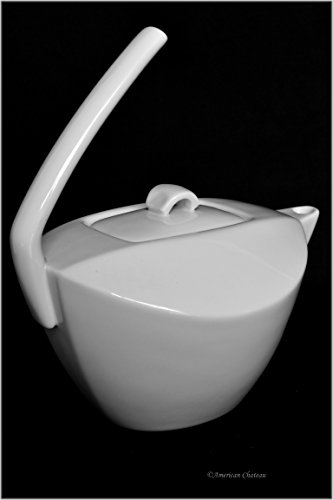 -. Title : Modern Asian 32oz White Porcelain Hotel-Style Teapot with Lid and Funky Handle