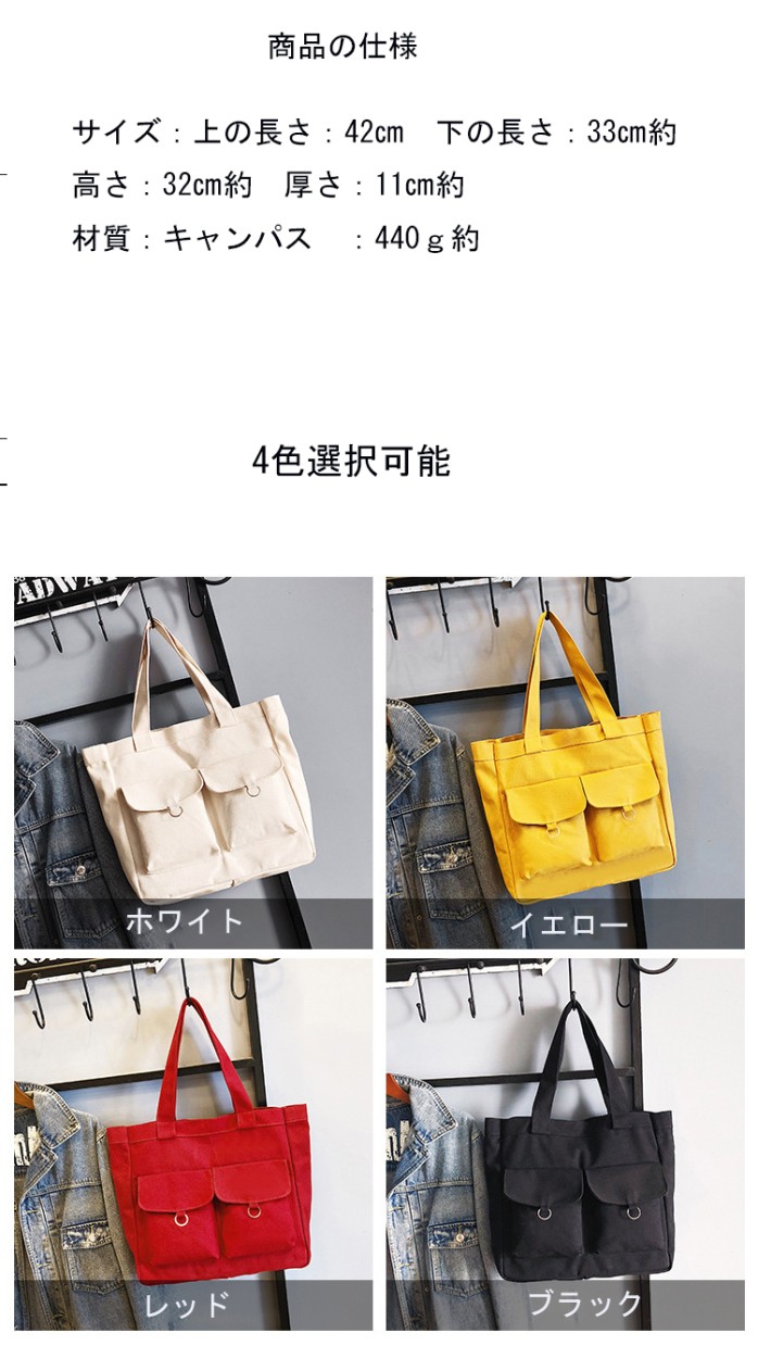 商品説明:◆伸縮性:有り◆厚さ:普通◆素材:キャンパス、ポリエステル◆バッグのサイズ:上の長さ:42m約 下の長さ:33cm約 高さ:32m約 厚さ:11m約◆色:写真通り(ブラック、イエロー、ホワイト、レッド)◆機能:トートバッグ、ハンドバッグ、ショルダーバッグ◆重量:440g約◆商品内容:1xバッグ特徴:【軽量、携帯便利】バッグが、軽量で、携帯便利です。出掛けに最適!!大きいサイズのトートバッグです。たくさんの商品が収納できます。旅行や出かけに最適です。普段のお出掛けで入りきらない物を持ち運ぶサブバックとして日々の日常生活で重宝するアイテムです。【ファッションなデザイン】欧米風なファッションのバッグなので、通勤や通学にも適用します!!【収納力あり】内側にポケットがあるので、機能的で収納力も抜群です。素材?作りもしっかりしているので、お出掛けはもちろん、通勤?通学、お買い物、マザーズバック、サブバッグとしても幅広くご利用頂けます。