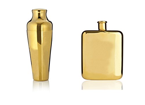 -. Title : Belmont: Gold Cocktail Shaker and Flask, Set of 2