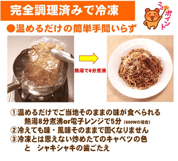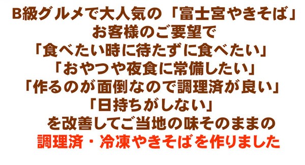 お客様のご要望で「食べたい時に待たずに食べたい」「おやつや夜食に常備したい」「作るのが面倒なので調理済みが良い」「日持ちがしない」などを改善してご当地の味そのままの調理済・冷凍やきそばを作りました。