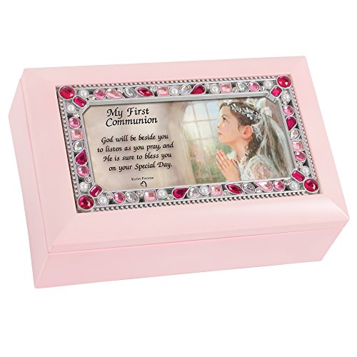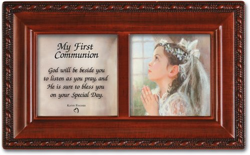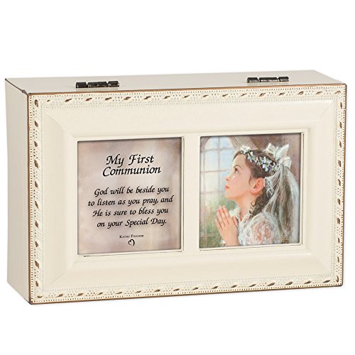 This beautiful jewelry music box makes a wonderful rosary keepsake box. It plays the classic tune Ave Maria with a high quality mechanical music mechanism that you wind up on the bottom of the box. You can watch through glass on the inside of the box as the music mechanism plays. The artwork in the photo frame lid can be replaced with a personal 4 x 2 inch photo of that special day. This is a gift that will last for a lifetime to commemorate that special day.Feature