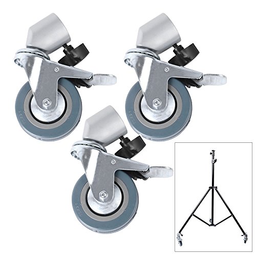 Brand new and high quality .Three Sets of Studio Caster Wheels for light stand and studio boom. These caster wheels make your studio equipment moving simple and allow you more convenient with your studio setup with less hassle. The wheels are universal suitable for all light stand.Smooth rolling wheels make moving stands a asnap. Locking wheels give safety and security to your equipment. Universal wheels suitable for all light stand. ? Features: Heavy duty construction for light stand, tripod Weight: only 2.8lbs each, lightweight and durable Wheel in 3" diameter, easy and smooth rolling With an adjust screw to fit most light stands With a stator to fit 1" light stand steadily Step on locks give safety and security to your equipment Material: Metal and rubber. ? Package Includes: 3x Caster Wheels 0 |