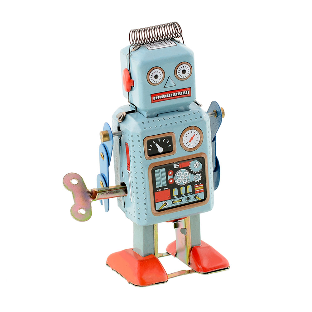 Simply wind it up and watch the cute little robot wobble and walk around.