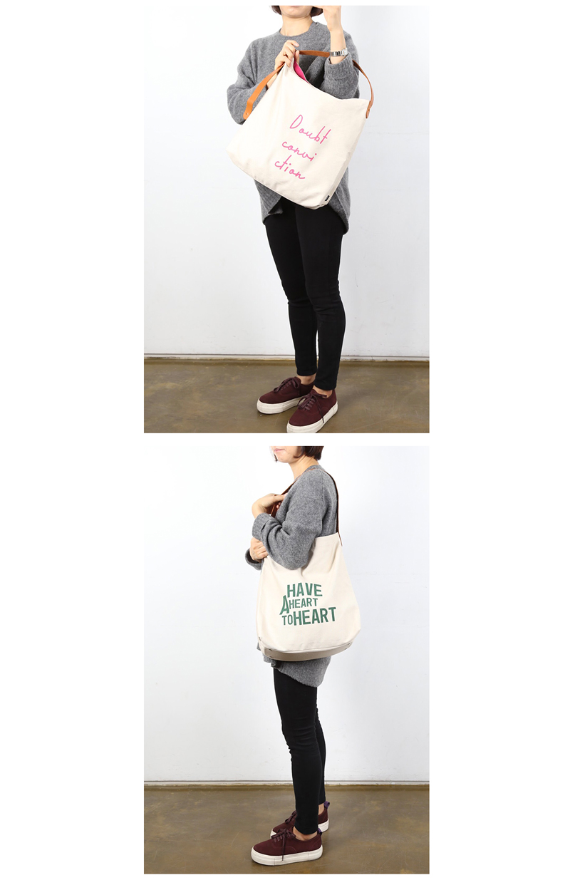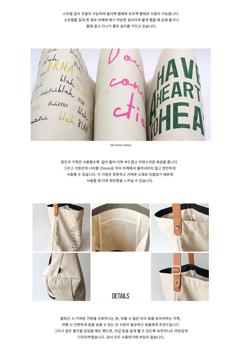 통가죽끈과 면 100% 트윌로 된 가방입니다. 가죽끈은 통가죽으로 생활 속에서의 사용을 통해서 자연스럽게 에이징되며 좀 더 부드러워집니다. 사계절 사용이 가능하며, 자연스러운 처짐이 멋스러운 가방으로 많은 물건을 담았을때 더 이쁜 가방입니다. 가방끈의 길이 조절을 통해 토트백과 숄더백으로 사용이 가능합니다. 그래픽 컬러에 따라 가방 안 쪽 포인트 컬러가 다르며, 속주머니 사이즈는 큰 편이라 지갑과 핸드폰등의 수납에 편리합니다. 이 가방은 가볍고 튼튼함을 기본으로 만든 가방입니다.
