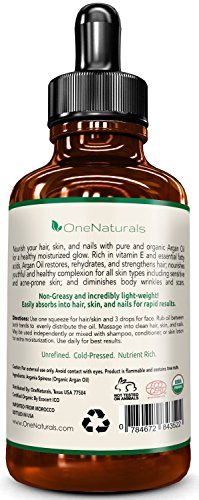 -. Binding : Misc. -. Brand : OneNaturals -. Feature : ✔ FRESH VIRGIN ARGAN OIL IS THE ONE SECRET TO UNLOCKING YOUR NATURAL BEAUTY! Our USDA-certified Organic Argan Oil is a light-weight, multipurpose oil that deeply hydrates hair, skin, and nails. It is 100% pure (unrefined), chemical and preservatives-free, cold-pressed, and imported directly from Morocco. Non-greasy and unscented. Apply directly or mix with your favorite lotion, shampoo, or other essential oils for enhanced moisturization. / ✔ TAME, RESTORE, AND SOFTEN YOUR HAIR IN A FEW DROPS! Control flyaways, reduce split ends, hydrate frizzy and damaged hair for months with our jumbo-sized bottle. Achieve and sustain smoother, silky, spa-like hair quickly with the light-weight and fragrance-free organic argan oil. Benefit from the same moisturizer that you use for your skin and nails! / ✔ SEEKING RADIANT, YOUTHFUL COMPLEXION FROM HEAD-TO-TOE? ACHIEVE IT RAPIDLY & NATURALLY. Extremely rich in vitamin E, antioxidants, and essential fatty acids, our 100 percent pure Argan Oil easily absorbs into your hair, skin, and nails to nourish a naturally radiant and youthful complexion. It multitasks to deliver healing, moisturizing, conditioning, and anti-aging treatment WITHOUT containing damaging chemicals such as parabens, sulfates, and phthalates. Whether you are simply conditioning your skin for a dewy-glow, treating dry and flakey scalp, or reducing wrinkles and stretch marks - do it with the confidence of using the freshest, nutrient-rich, and highest-purity argan oil available. / ✔ RELIEF FOR SENSITIVE SKIN! REPAIR & REJUVENATE NOW! Acne-prone? Eczema or Psoriasis? Aging skin? No problem. Our all natural Argan Oil is safe for all skin, hair, and nail types. It is popularly used to moisturize sensitive skin (especially beneath the eyes); diminish wrinkles and scars; rehydrate dry and environmentally damaged skin (eg. pool chlorine or dry weather); and combat old-aging effects. You are not getting any younger! Do not wait any longer to begin nourishing your skin! / ★ RISK-FREE, LIFETIME MANUFACTURER GUARANTEE - When you choose OneNaturals, you choose guaranteed satisfaction and beautiful results for life. We stand behind all of our products and their ability to deliver the amazing results you expect. If you are not completely satisfied with your purchase, you can return it for a replacement or a refund at any time. Buy with confidence today! -. Label : OneNaturals -. Manufacturer : OneNaturals -. ProductGroup : Beauty -. ProductTypeName : BEAUTY -. Publisher : OneNaturals -. Studio : OneNaturals -. Title : OneNaturals Argan Oil - 100% Pure & USDA ORGANIC Argan Oil for Hair, Skin, Body, Nails - LIFETIME Satisfaction Guarantee - Pump & Dropper Bottle - OneNaturals Virgin Argan Oil Unscented, Unrefined, Cold-Pressed, Imported from Morocco - Non-Irritating to Sensitive Skin - Fresh & Chemical-Free