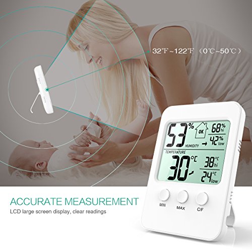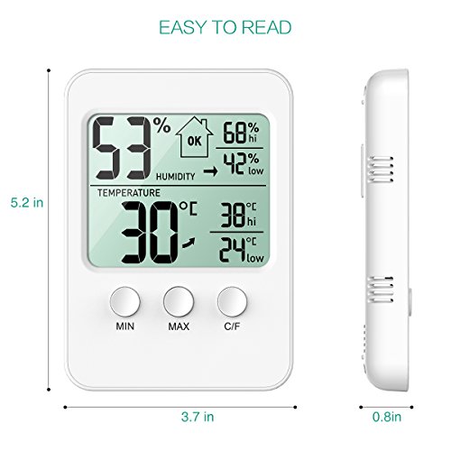 - 1. LARGE LCD SCREEN: 3.7 inches large LCD screen displays current indoor temperature and humidity, which makes it clear legibility. It shows the MAX & MIN temperature and humidity records in the past. The temperature measurement range: 32°F to 122°F (0°C to 50°C).