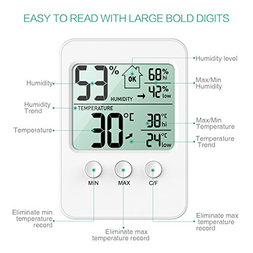 - 5. GREAT FOR INDOOR USE: It shows indoor temperature and humidity value, and the trend of temperature and humidity by different arrow point. Humidity level icons show current air conditions -- HIGH/OK/LOW. It is eligible for home, office, wine cellar, greenhouse, etc.