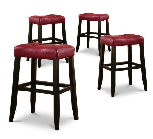 -. Brand : The Furniture Cove -. Color : black;red -. Feature : Set of 4 Bar Stools / Done in the Saddle Style / Red Finish Seat / 29" Tall To Seat Dimensions: 16" X 22" X 29" H / Seat Cushion: 19 1/2" W X 14" -. Label : Crown Mark -. Manufacturer : Crown Mark -. ProductGroup : Furniture -. ProductTypeName : HOME_FURNITURE_AND_DECOR -. Publisher : Crown Mark -. Size : 4 - 29" stools -. Studio : Crown Mark -. Title : 4 29" Red Cushion Saddle Back Black Finish Bar Stools