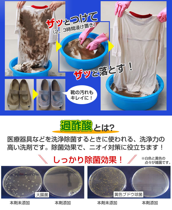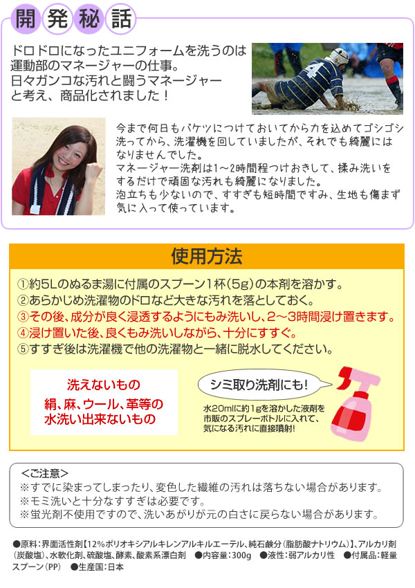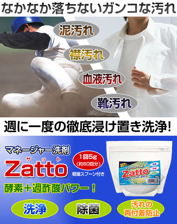 | ユニフォームを洗う運動部のマネージャーの意見を参考に作った、ガンコ汚れ専用浸けおき洗剤です。ザットつけてザット洗えます。液性:弱アルカリ性。 |