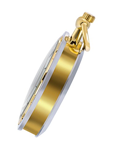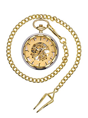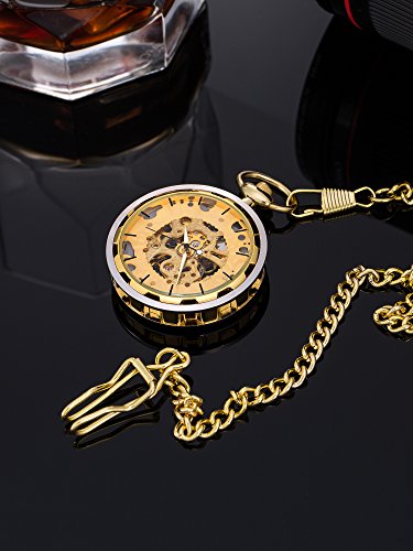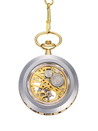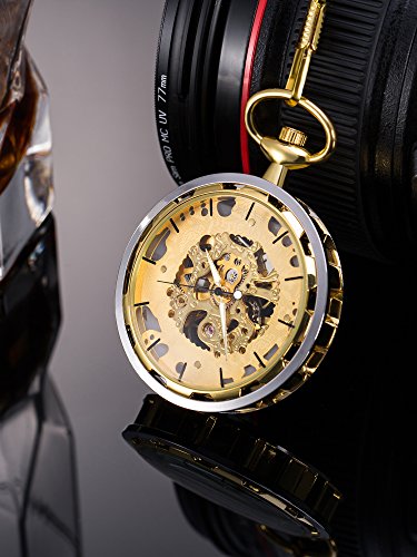 -. Feature : Clear appearance: the pocket watch in silver and black without Roman numerals on dial face, clear appearance with gold movement, easy to read time and allow a whole view of the gear / Gold chain: the pocket watch with a gold chain, the size of the chain is approx. 37.5 cm/ 14.8 inches in length, suitable for hanging and putting it in your pocket / Setting time: mechanical hand-wound movement without any battery; Twisting the top button on the spin, tightening a walk for 24 hours (not too tight, avoid damaging the movement) / Application: comes with a gift box and microfiber cloth for daily easy cleaning, you can apply them for suit, vest, pants or other clothes / Good gift: the pocket watch with good workmanship, precise mechanical movement, classic case with long chain, good touch feeling, good gift for yourselves, friends, relations or other people