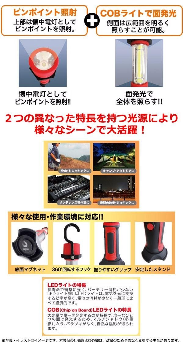 握りやすいグリップと安定したスタンド、マグネットやフックも付いて使いやすい!ピンポイント照射と面発光の2つの異なった特徴を持つ光源により、様々なシーンで大活躍!! |