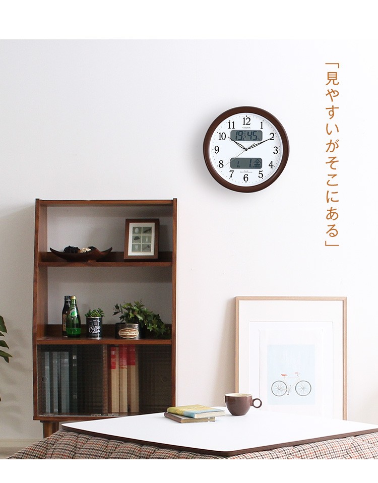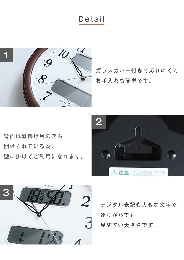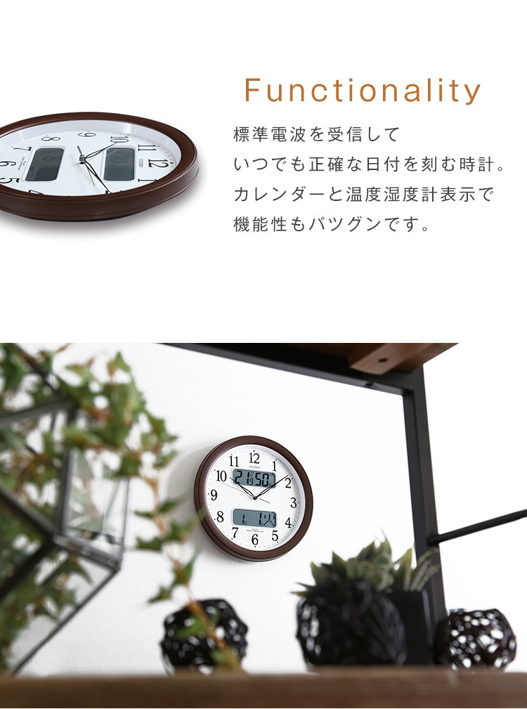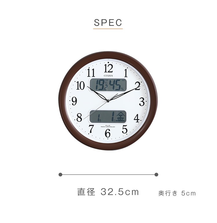 【商品について】シチズン掛け時計(電波時計)カレンダー・温度湿度表示 メーカー保証1年|ネムリーナカレンダーM01■サイズ:外寸:(約)直径 32.5cm 奥行き 5cm※商品重量:(約)1.08kg■カラー:ブラウンメタリック■素材:・プラスチック枠・風防:ガラス製■その他:・梱包サイズ:(約)38x38x7.5cm・梱包重量:(約)1.7kg【商品名】シチズン掛け時計(電波時計)カレンダー・温度湿度表示 メーカー保証1年|ネムリーナカレンダーM01