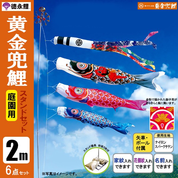 | 黄金兜鯉 庭園用大型鯉のぼり スタンド砂袋式ポール付セット | 1.5m鯉3匹 | 2m鯉3匹 | 3m鯉3匹 3m鯉4匹 3m鯉5匹 | 4m鯉3匹 4m鯉4匹 4m鯉5匹 |