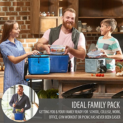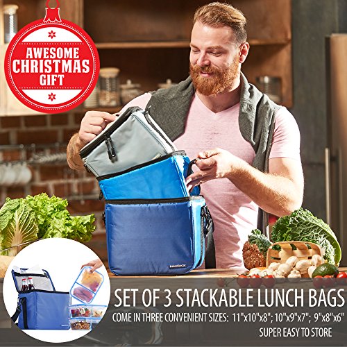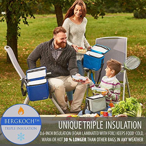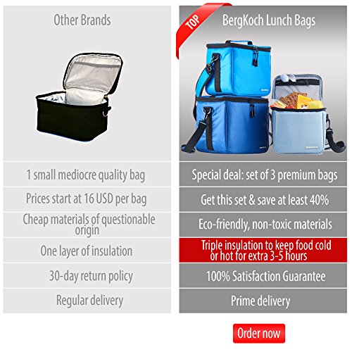 Studio : BergKoch Publisher : BergKoch Product Description Meet our new awesome set of 3 portable insulated lunch bags for a big family! Separate bags for separate needs!Versatile use, classic design, nice stylish details and original durable construction - finding a pretty cute fashion lunch box has never been easier.Brand: BergKochMens, guys, womens, ladies, young children, toddlers, babyColors and size: large deep blue (navy), middle light blue, little gray (mini grey)Occasion: camping, picnic, grocery shopping, car travel, outdoor travel, work, fitness training, traveling, backpacking, workout, office, gym, sports practice, home, college, preschool, school, dinner, breakfastAlternative use: grocery, diaper or camp bag, make up case, cosmetic organizer kitBest for: square and rectangular glass, plastic and metal food containers, meal prep container, ready meals, breastmilk, salad, soup, liquid and dry snack, sandwich, wine bottles, beverage drink, soda, coke and beer cansMultilayer insulation: extra thick triple insulation (foam with foil) provides prime protection for your food and keeps it fresh, cool, cold, frozen, warm, heated or hot for 3 hours longer or all day with an ice packInside: a mesh pocket and zip compartment for napkins, utensils, kitchen accessories and other small stuffLining: hand washable eco friendly foods safe white PEVA linerFeatures: sets of 3, bright colors, multi purpose, trendy simple style, high capacity, compact, stackable, reusable, freezable, thermos, leakproof, pantry storage, heavy duty black carrying handle, extra long dark shoulder strap designed specifically for the tall to carry, easy grip good rubber zippers, soft lightweight outer material of premium deluxe top qualityForget about old cheap slim disposable collapsible foldable folding tiny thin neoprene bags!Don't feel divided between super high performance and unique fashionable design! Our fancy cooler lunch boxes pack has got it all. Wonderful gift for Life 0