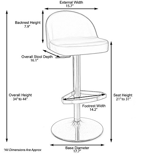 -. Brand : Zuri Furniture -. Feature : Overall: 16 inch(W) x 18 inch(D) x 40 inch(H) / Seat: 16 inch(W) x 14 inch(D) x 11 inch(H) / Overall Height: 34" to 44" - Seat Height: 21 to 31" / Bar stool features a brushed stainless steel base and an adjustable seat height to fit any counter. / Additional color swatches available. Please contact showroom for more information. -. Label : Zuri Furniture -. Manufacturer : Zuri Furniture -. ProductGroup : Furniture -. ProductTypeName : HOME_FURNITURE_AND_DECOR -. Publisher : Zuri Furniture -. Studio : Zuri Furniture -. Title : Mimi Adjustable Height Swivel Armless Bar Stool with Brushed Chrome Base