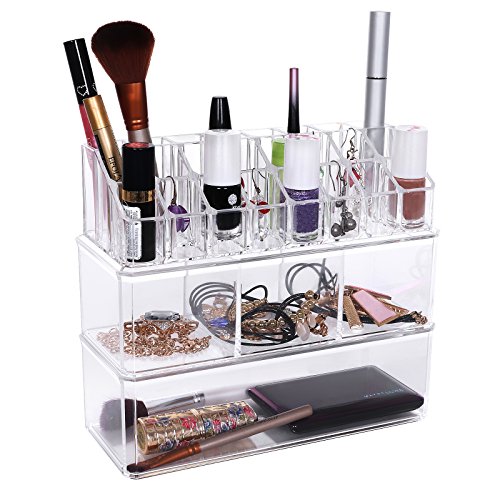 -. Feature : ACRYLIC ORGANIZER - Durable crystal-clear acrylic makes it match any decor in your room and allows you to see your jewelry & cosmetics clearly / VERSATILE HOLDER - 24 square compartments, 3 large-sized section and 1 lid-covered containers, ideal for cosmetics, jewelry, office items, art supplies and craft items / INTERLOCKING & DETACHABLE DESIGN - With the recess on top of the box, three separate pieces can stack together properly, you can also use them separately / THOUGHTFUL GIFT CHOICE - elegant appearance and practical design, perfect gift for the one you love to keep her counter clutter free / DECENT SIZE - 10 5/8"x 10 1/8" x 5 1/8", provide enough room to hold all your items in one place