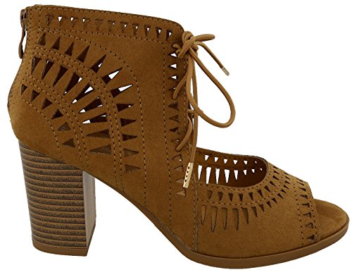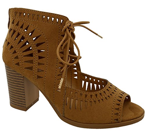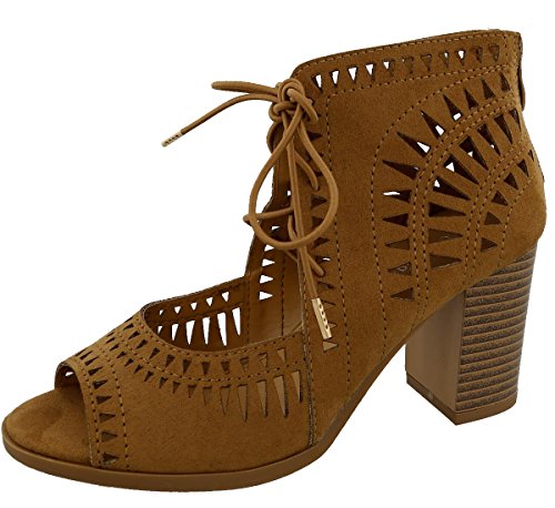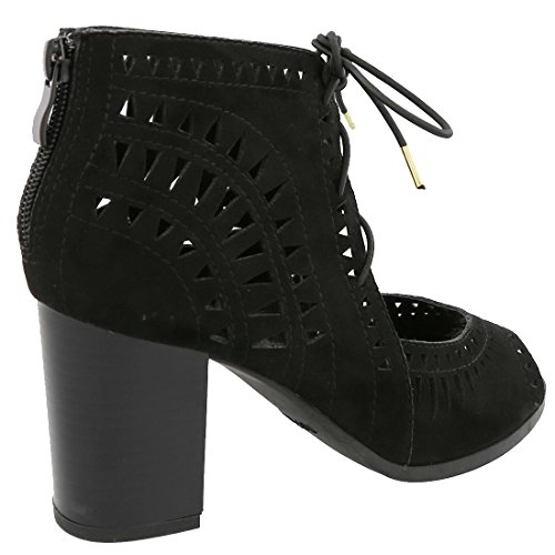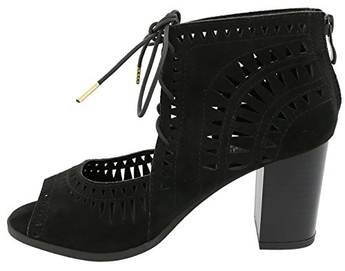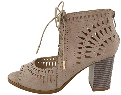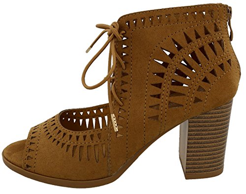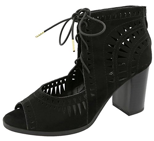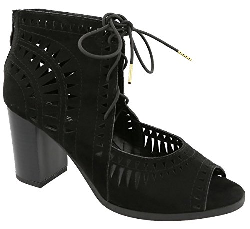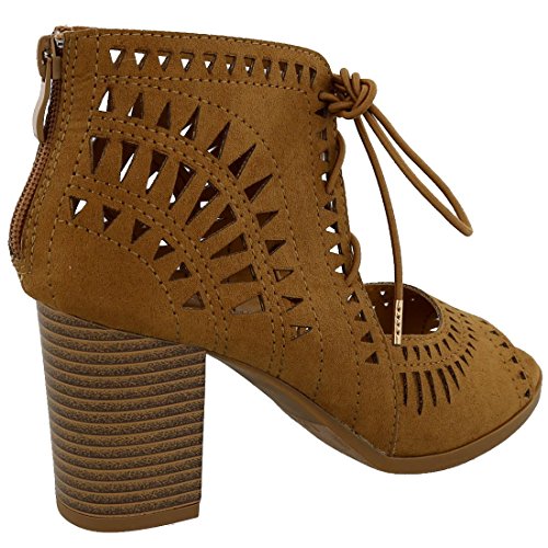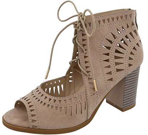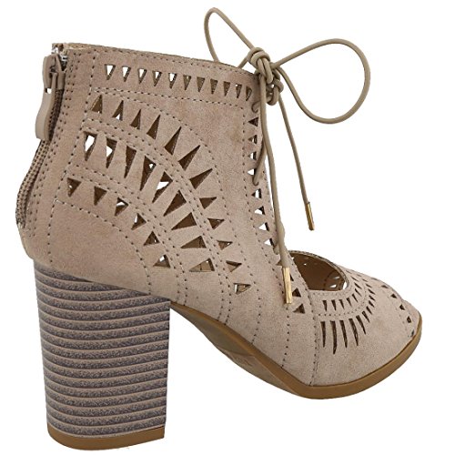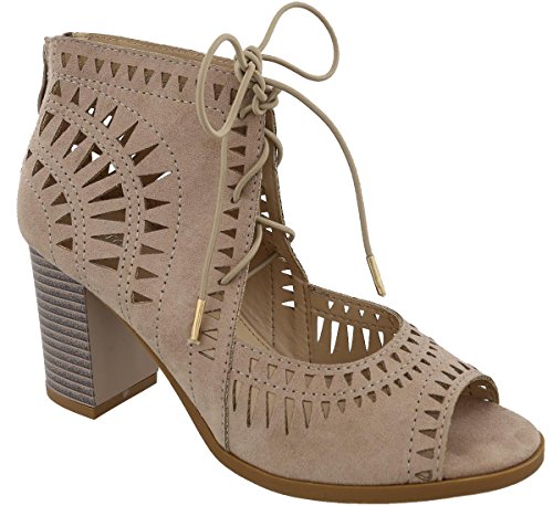 Top Moda Women's Laser Cut Lace Up Stacked Chunky Heel Ankle Bootie Sandal