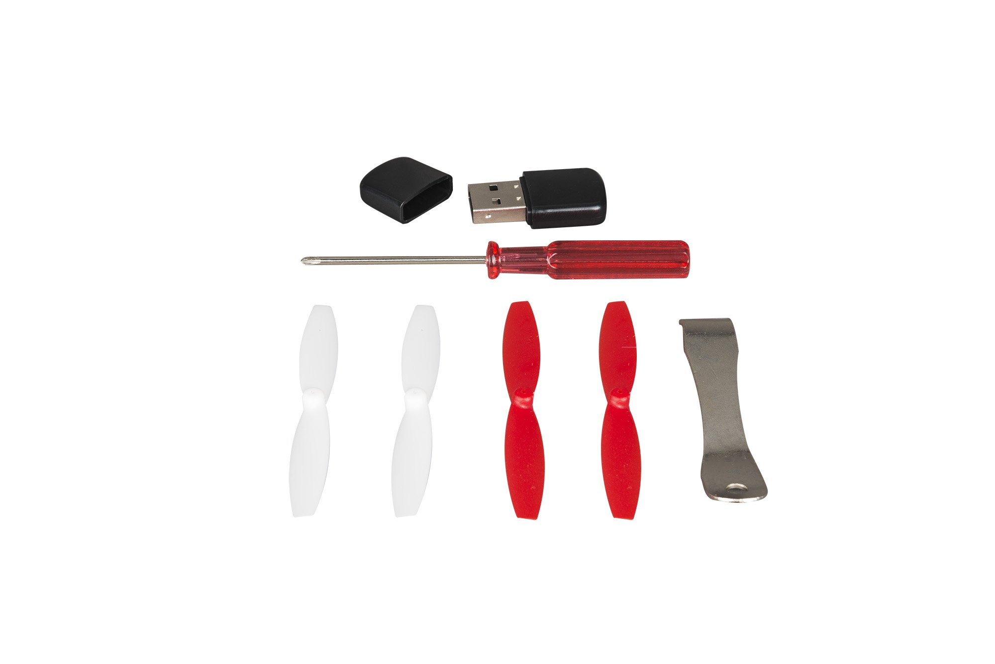 Main body, transmitter, dedicated USB charger × 1 pcs, spare rotor set × 1 set, rotor guard × 1 set, skid (foot stand) × 1 set, MicroSD dedicated adapter × 1 pcs