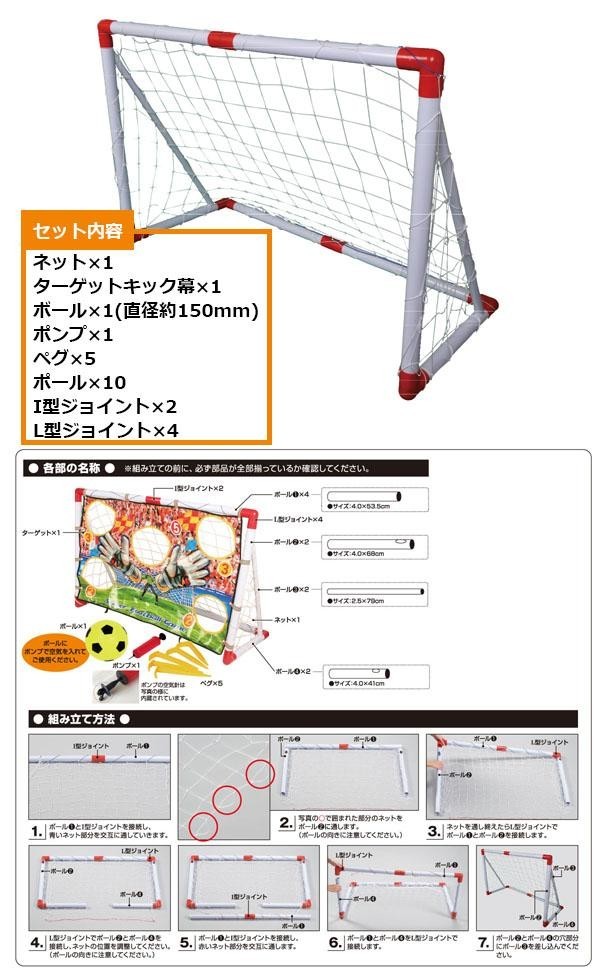 | セット内容 | ゴールネット×1・ターゲットキック幕×1・ボール×1(直径約150mm)・ポンプ×1・ペグ×5・ポール×10・I型ジョイント×2・L型ジョイント×4 |