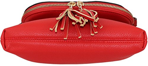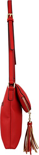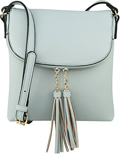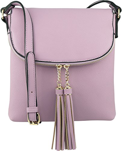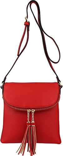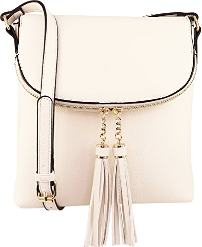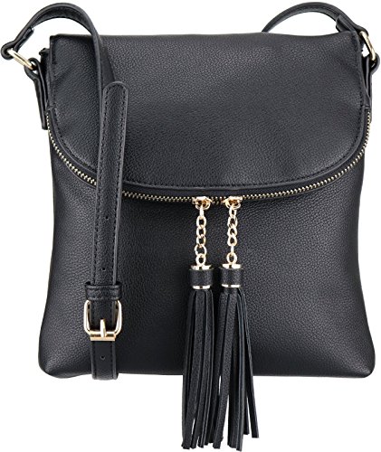Fashion crossbody handbag that is made with faux leather with a black and white striped fabric lining. It has a zipper closure at the top of the flap which extends to the bottom of the purse that closes with a magnetic clasp. There are three other pockets: one zipper pocket on the back side of the purse, one pocket in the lining and a zipper pocket inside of the purse. There are tassel accents on the zipper on the flap.