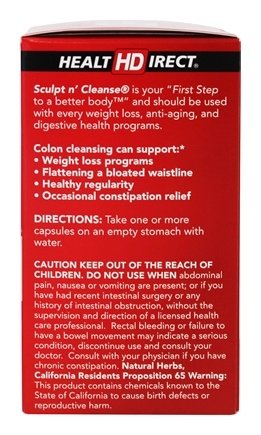 -. Binding : Health and Beauty -. Brand : Health Direct -. Feature : Effective, yet gentle and safe colon cleansing formula / Should be used in conjunction with any weight management, body shaping program / Helps to eliminate toxins, chemicals, pollutants and poisons from the body -. IsAdultProduct : 0 -. Label : Health Direct -. Manufacturer : Health Direct -. NumberOfItems : 1 -. PackageQuantity : 2 -. ProductGroup : Health and Beauty -. ProductTypeName : HEALTH_PERSONAL_CARE -. Publisher : Health Direct -. Studio : Health Direct -. Title : Sculpt n' Cleanse 100 Capsule (Pack of 2)