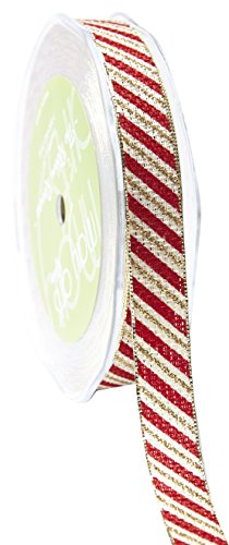 May Arts Ribbon 532-58-30 5/8" Candy Cane Ribbon with Metallic Edge, 25 yd, Ivory/Red/Gold