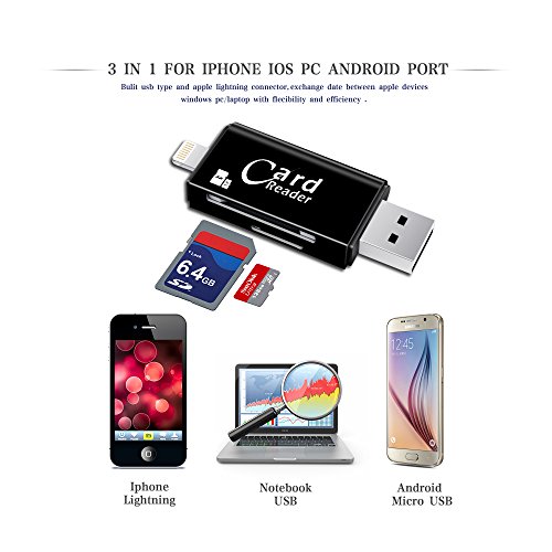 • Usb memory card reader, fit all your devices with three interfaces: Lightning connector is for IOS devices; Micro USB connector is for Android devices; USB connector is for computers/Mac.