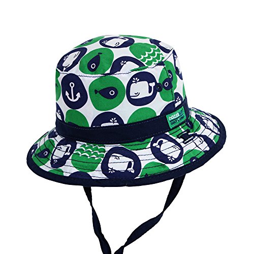 Product Description The Whaley is a Baby Boys Reversible Bucket Hat by Dozer and it's great choice you want to protect your little one from the harmful UV rays with this UPF50 rated, incredibly cute Dozer Bucket Sun Hat with an adorable green and navy Whale Pattern Print. This Boys Sun Hat is made from Quick-Dry Moisture Wicking Microfiber Fabric, it is a must-have for the Beach or a day out and about in the summer sun. You get to choose from the the lovely Whale Motif on the main side of the hat or simply reverse the baby hat to reveal a gorgeous Green Block Color print - yes, you get to maximise the lifespan of your baby boys hat with these reversible hat options! This hat is a hardwearing original, designed to endure a range of tough, hot conditions, making this Boys UPF Sun Hat the perfect sun hat for you baby boy's outdoor activities and playtime. Whether your son is in the sand, the mud, the water, running, walking or sliding - the Dozer Reversible Bucket Hat will protect them from harsh UV rays and provide you with peace of mind. Dozer Boys Sun Hats hats are built to last with the most active of boys in mind. Our Removable Chin Straps make it easy to reverse the sun hat. Simply unclip, reverse and re-attach the chin strap then use the toggle to secure the sun hat under your little one's chin to keep it comfortable in place, even on blustery days. The approximate brim length 1.9-inches. This sun hat is available in 2 sizes: Small at 17 inches is suitable For ages 0-1 years; the Large is 19 inches for boys aged 1-2 years 0