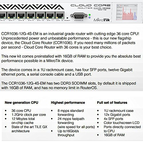 -. Feature : Mikrotik CCR1036-12G-4S-EM is an carrier grade router with a cutting edge 36 core Tilera CPU / Tilera Tile-Gx36 CPU (36-cores 1.2Ghz per core) / MikroTik RouterOS v6 (64bit) Level 6 license / 12x Gigabit ports - 1U rackmount case - 4x SFP ports 1.25G / Router in a 1U case with LCD PSU power cable usb cable