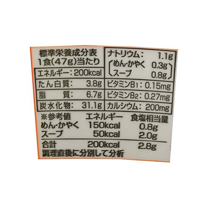 원재료:유부 면(소맥분,식물성 기름지,식염,당류,분말란)고, 스프(된장,식염,당류,향신료,포크 엑기스,돈기름,소맥분,식물성 기름지,효모 엑기스,발효 조미료)고, 인지(든가) 질투하다(양배추,콘,파,(당근)인삼)고, 가공 나오지 않겠 분,조미료(아미노산등)고, 탄산 칼슘,카라멜 색소,증점다당류,물어 들이마시고, 치자나무 색소,신맛료,산화 방지제(비타민E)고, 향신료 추출물,비타민B2,비타민B1,(원재료의 일부에 유성분,참깨,닭고기를 포함한다)