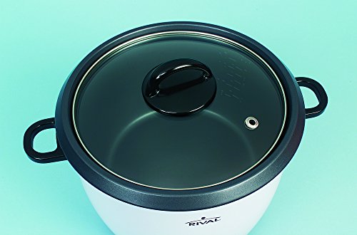 Cook and keep-warm settings; domed glass lid; stay-cool side handles