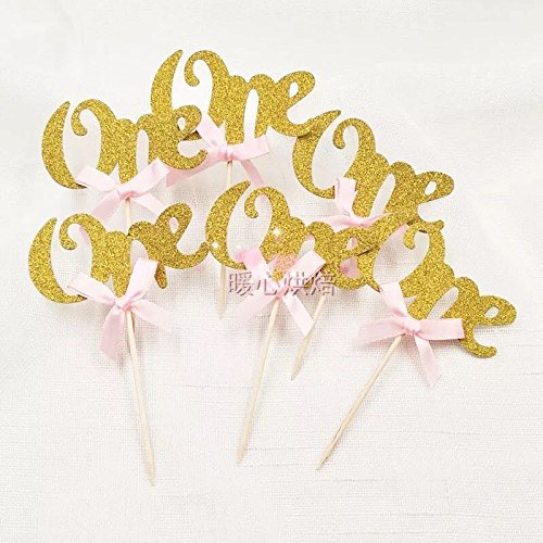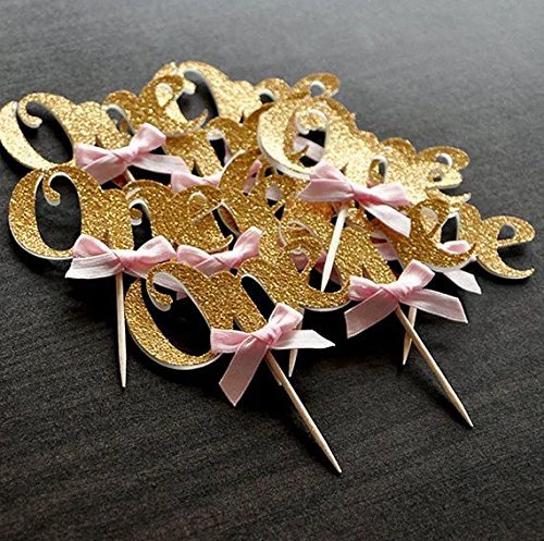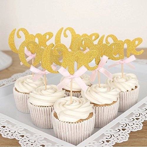 Astra Gourmet 24PCS Glitter Gold One Cupcake Topper Pink Bow 1st Birthday Party Anniversary Decoration