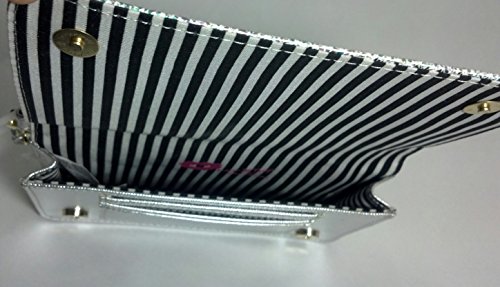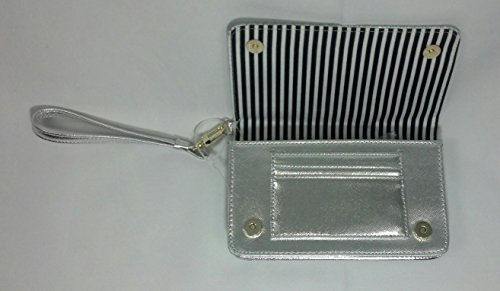 Betsey Johnson's silver wristlet, removable wristlet, two magnetic snaps, three card pockets, black and white stripes on the inside, and able to hold cellphones.