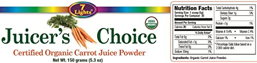 Start using 7 Lights Juicer's Choice certified organic carrot juice powder and put your health on the right track by consuming more whole foods on a daily basis. 7 Lights Juicer's Choice carrot juice powder is simply delicious. Mix 1 scoop thoroughly with water and enjoy. Juicer's Choice is also excellent when mixed with any vegetable or citrus juice.