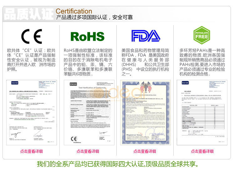 FDA、ROHS等欧美最高标准认证。