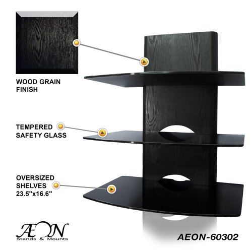 -. Binding : Electronics -. Brand : Aeon Stands and Mounts -. Color : Black -. EAN : 0689466135770 -. Feature : Oversized heavy duty child safe shelves fit even the largest components / Shelf size : 23.5" wide x 14.5" deep. -Holds up to 35 pounds per tier/shelf / Gain valuable floor space with this beautiful component shelf. / Beautiful wood grain finish with smoked glass, includes easy to use cable management. / Made from 8mm strong and safe tempered glass- Child safe -. Label : AEON Stands and Mounts -. Manufacturer : AEON Stands and Mounts -. Model : AEON-60302 -. MPN : AEON-60302 -. PackageQuantity : 1 -. PartNumber : AEON-60302 -. ProductGroup : Speakers -. ProductTypeName : AV_FURNITURE -. Publisher : AEON Stands and Mounts -. Size : 31.60" Tall x 23.50" Wide x 16.60" Deep -. Studio : AEON Stands and Mounts -. Title : Component Shelf Mount with wood grain and three large glass shelves AEON-60302 -. UPC : 689466135770
