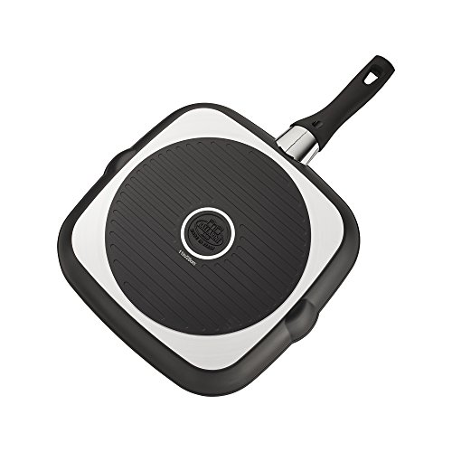 Made in Italy, Ballarini infuses the rich tradition of Italian cuisine into easy-to-use pans for everyday cooking. With the Como 11" Aluminum Nonstick Grill Pan, enjoy the benefits of a barbecue in the comforts of your kitchen. The exceptional Keravis Plus nonstick coating boasts quick release for flawless burgers, steaks, chops and chicken breasts that won't stick. Extremely resistant to scratches and chips, this PFOA-free coating lengthens the lifespan of your pan. The easy-to-clean surface ensures that no time is wasted on washing and more time can be spent on cooking. Ballerina's innovative heat-sensitive handle turns red when hot and green when cool. This lets you know when the pan's temperature is just right for cooking—preventing unnecessary overheating or undercooking—and properly cooled off for cleaning. Made from the most pure aluminum in the industry, the grill pan's cold forged body heats up rapidly and evenly with no hot spots. Three times more energy efficient than cast iron, aluminum is also wonderfully light, eliminating any arm strain. The ergonomic, stay cool handle offers a comfortable grip for maximum control. With Ballarini, experience the ease of nonstick expertise.Feature