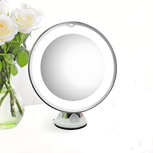-. Feature : 7X Magnification: The ideal magnification allows you to see whole face in the mirror, perfect for your daily makeup and grooming. / LED Illumination: Powered by 3 AAA batteries, the energy efficient LED light improves visibility when you do makeup in the dark or poorly lit areas. / 360 Degrees Adjustable: Can fix the mirror at any position to give you the perfect viewing angle via 360 degrees swiveling ball joint. / Suction Cup Installation: Comes with twist locking suction cup, easy to mount and re-position on any smooth, clean and flat surfaces like glass, granite, marble etc. / Elegant Design: Endowed by elegance and practicability, the mirror is chrome finished and in beautiful glossy white casing. Mirror diameter about 5 inches