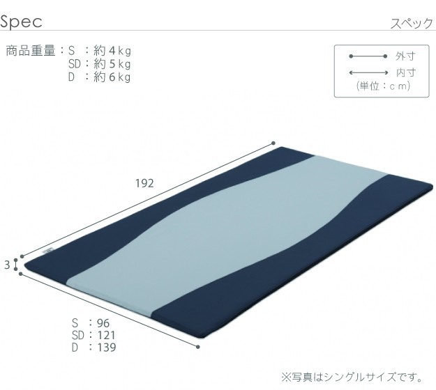 ※メーカー直送のため代金引換はお受けできません。※沖縄・一部離島は別途送料がかかります。お見積もりいたしますのでお問い合わせ下さい。【仕様】側地:ポリエステル100%中身:指定外繊維100%(防ダニ加工・抗菌防臭加工)中袋:ポリエステル100%カバー:ポリエステル100%(取り外し可能・ウォッシャブル)【サイズ】幅96x奥行192x高さ3cm重量:約4kg株式会社ナカムラ(61400424)